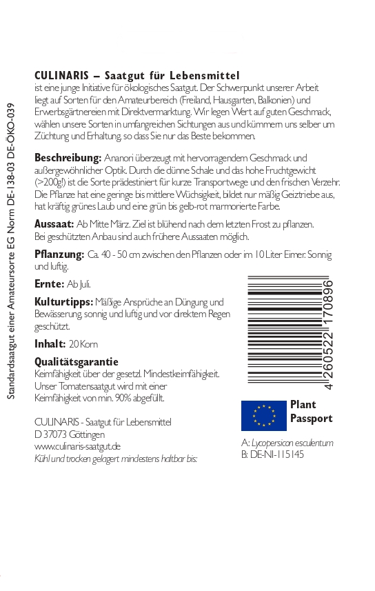 Ananori ist eine ältere Fleischtomate mit hervorragendem Geschmack und außergewöhnlicher Optik. Durch die dünne Schale und das hohe Fruchtgewicht (>200g!) ist die Sorte prädestiniert für kurze Transportwege und den frischen Verzehr. Die Pflanze hat eine geringe bis mittlere Wüchsigkeit, bildet nur mäßig Geiztriebe aus und hat kräftig grünes Laub. Die Früchte sind flachrund, leicht gerippt und haben je nach Reife und Anbaubedingungen eine grün bis gelb-rote marmorierte Farbe.