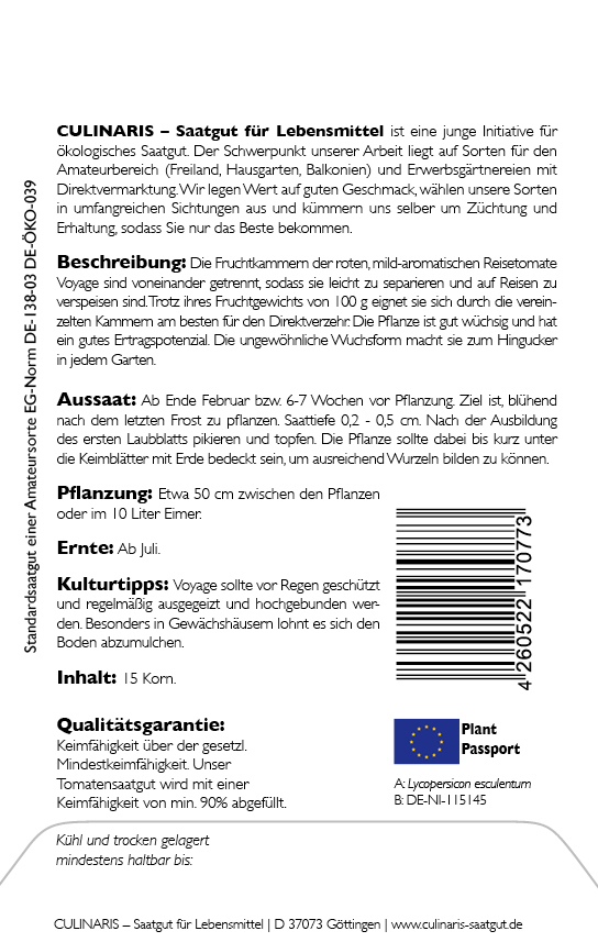 Die Fruchtkammern der roten, mild-aromatischen Reisetomate Voyage sind voneinander getrennt, sodass sie leicht zu separieren und auf Reisen zu verspeisen sind. Trotz ihres Fruchtgewichts von 100 g eignet sie sich durch die vereinzelten Kammern am besten für den Direktverzehr. Die Pflanze ist gut wüchsig und hat ein gutes Ertragspotenzial. Die ungewöhnliche Wuchsform macht sie zum Hingucker in jedem Garten. Die Reisetomate sollte geschützt unter einem Dachüberstand oder im Gewächshaus angebaut werden. Die Pflanze sollte man regelmäßig ausgeizen und aufbinden. Eine ausreichende Nährstoffversorgung erhöht den Ertrag.