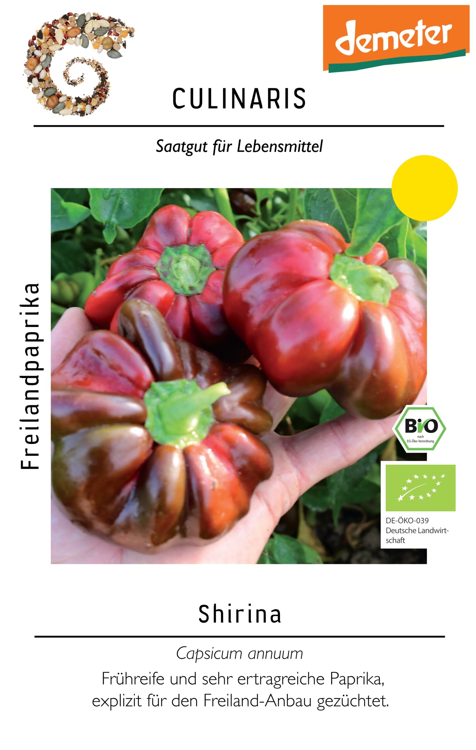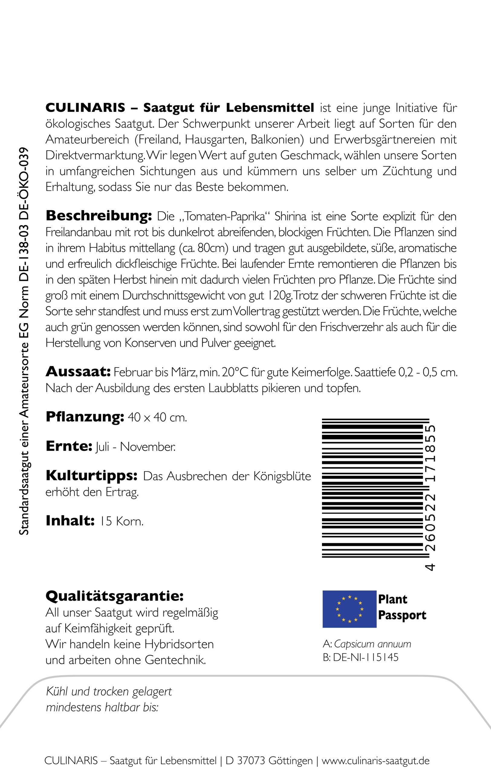 Die „Tomaten-Paprika“ Shirina wurde von Dr. Hartmut Spieß, Pionier der biodynamischen Züchtung, auf dem Dottenfelder Hof gezüchtet und im Jahr 2024 angemeldet. Sie ist eine Sorte explizit für den Freilandanbau mit rot bis dunkelrot abreifenden, blockigen Früchten. Die Pflanzen sind in ihrem Habitus mittellang (ca. 80cm) und tragen gut ausgebildete, süße, aromatische und erfreulich dickfleischige Früchte. Bei laufender Ernte remontieren die Pflanzen bis in den späten Herbst hinein mit dadurch vielen Früchten pro Pflanze. Die Früchte sind groß mit einem Durchschnittsgewicht von gut 120g. Trotz der schweren Früchte ist die Sorte sehr standfest und muss erst zum Vollertrag gestützt werden. Die Fruchtreife der Paprika setzt im Juli ein. Die Früchte, welche auch grün genossen werden können, sind sowohl für den Frischverzehr als auch für die Herstellung von Konserven und Pulver geeignet.